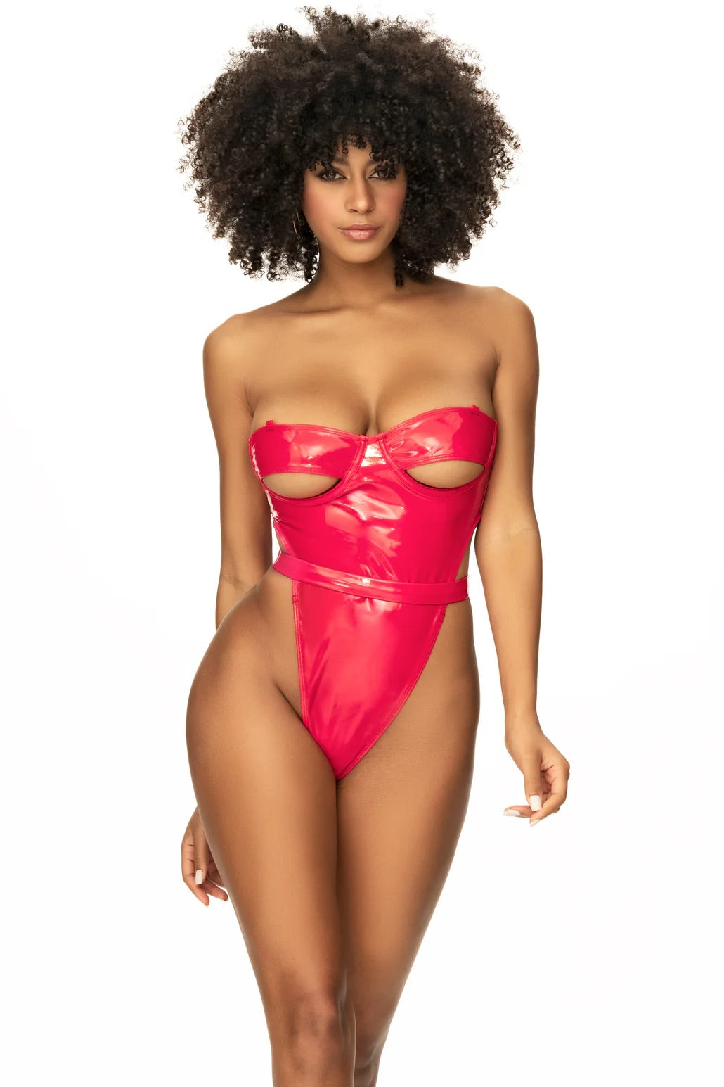 A daring high-cut bodysuit in red hot vinyl with underwire, underboob design, removable adjustable straps and adjustable crotch fastening.