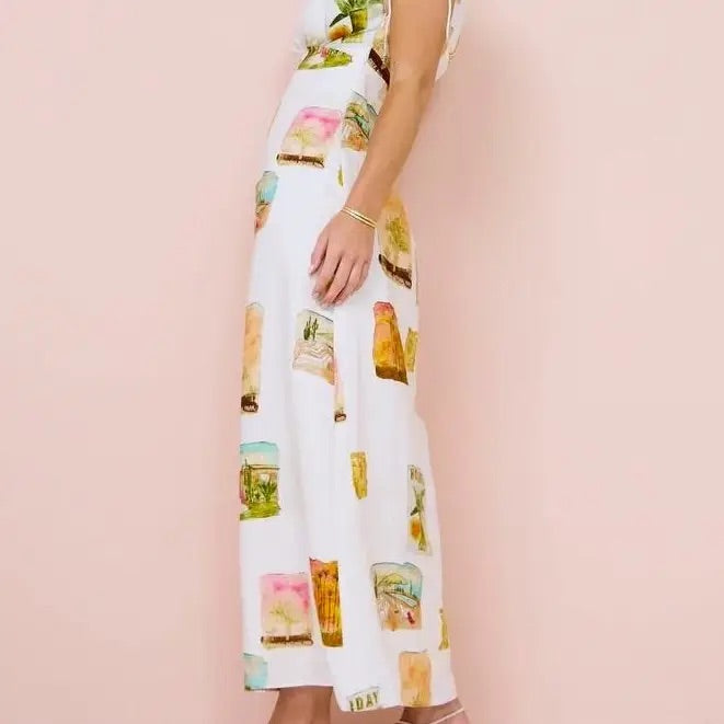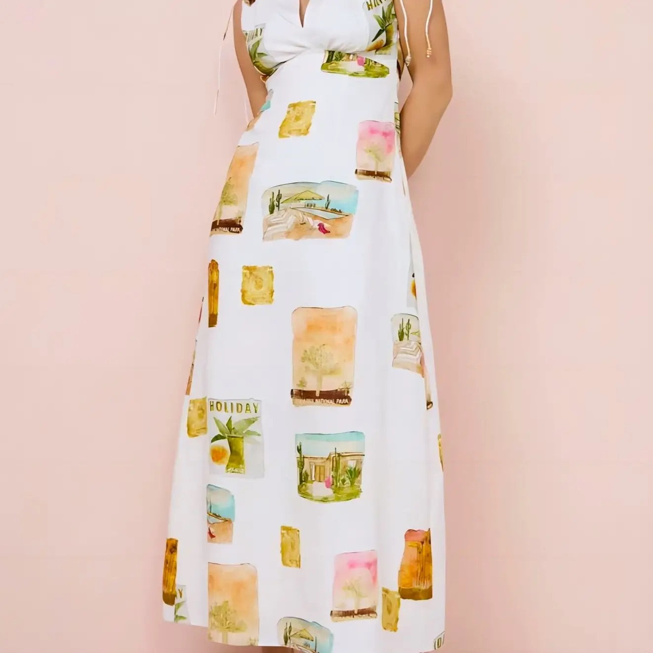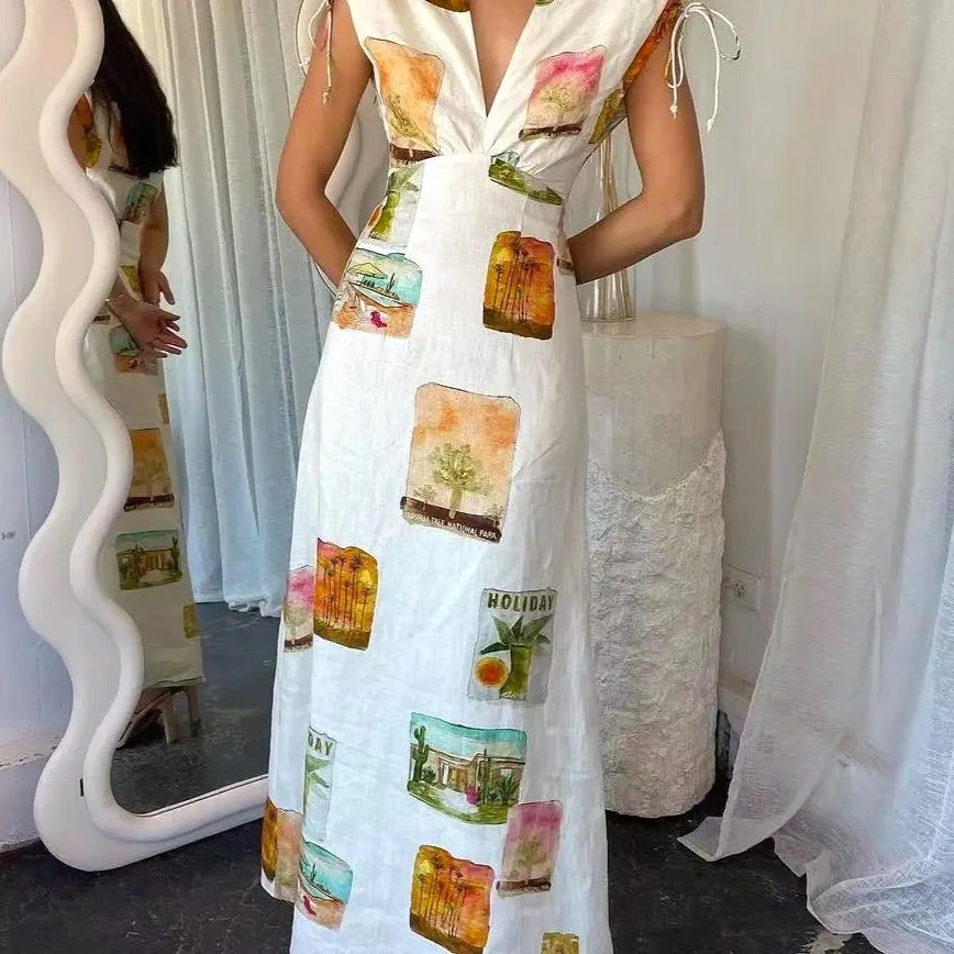 CHIC PRINTED V-NECK TIE HIGH-WAISTED DRESS