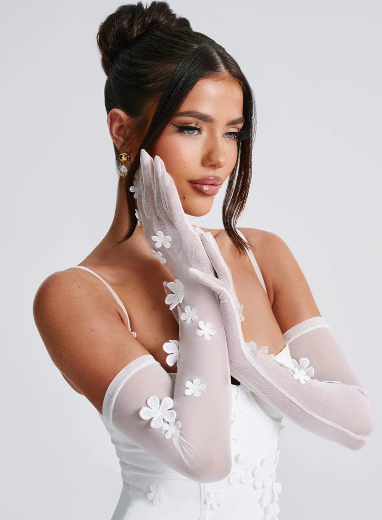 Introducing the finishing touch to the Dalary mini or maxi. Made in our delicate sheer mesh with stretch, these unlined gloves are scattered with pretty 3D floral applique all over. They finish at the elbow for a flattering fit.