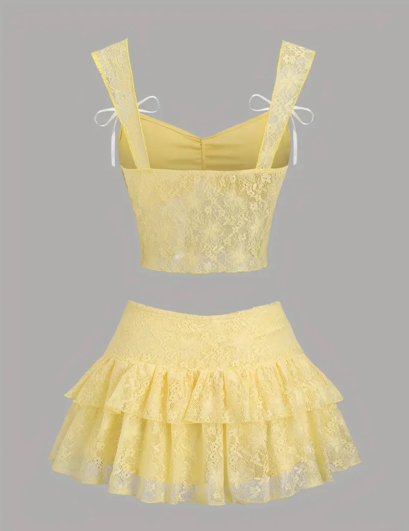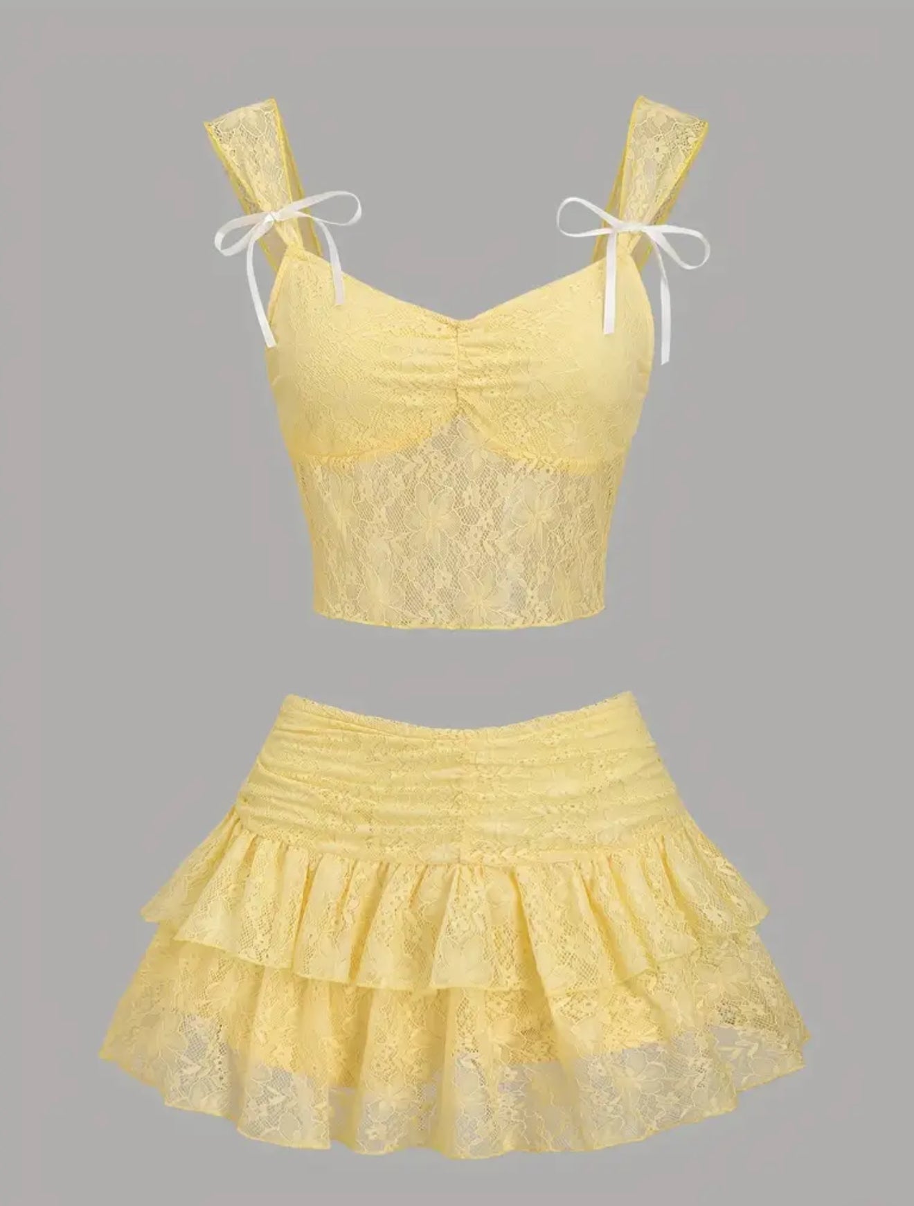 Elegant Women'S 2pcs Lace Cami Top and Ruffled Skirt Set with Bow Details, Polyester, Strappy Back Design, All-Season Wear, Lace Fabric