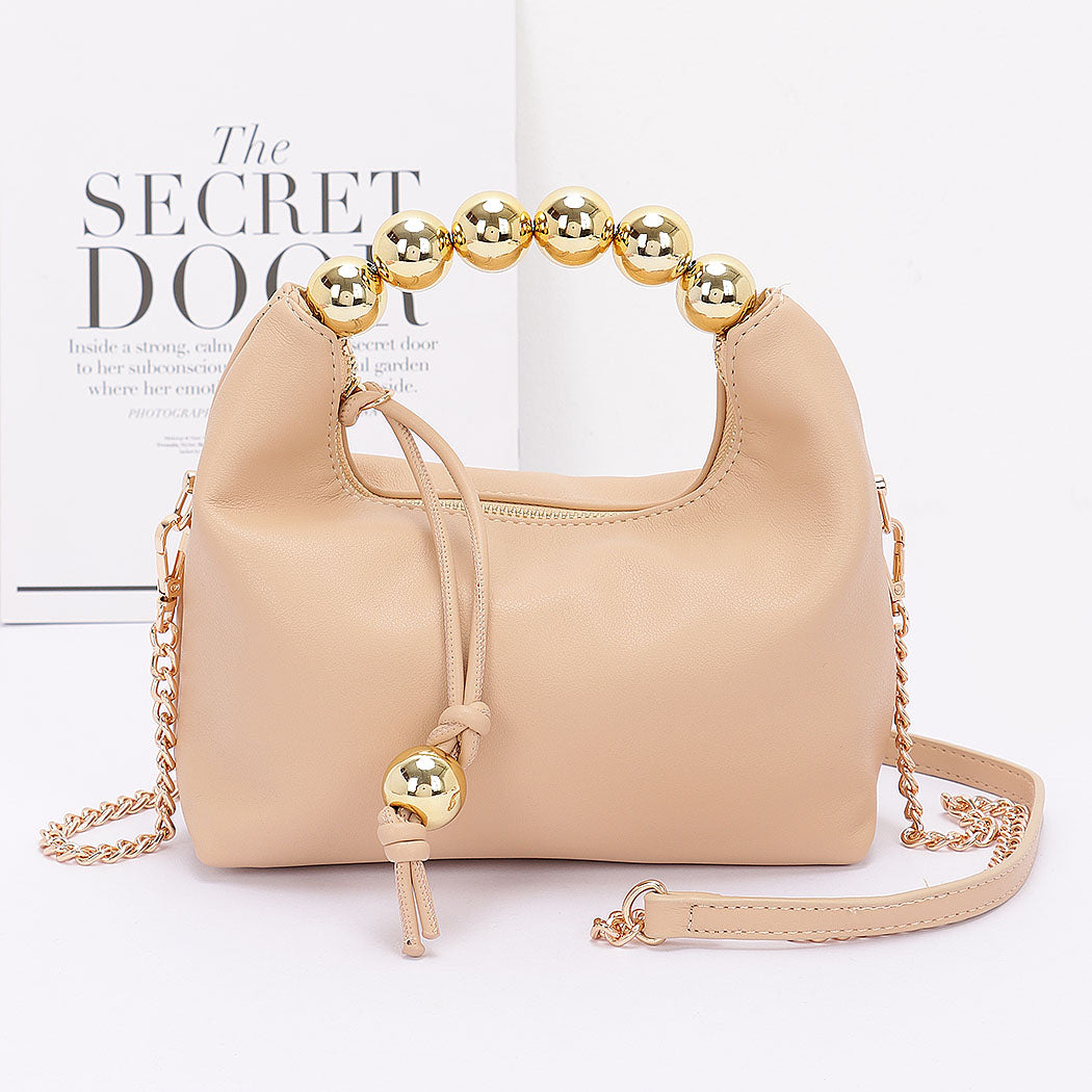 * Faux Leather CCB Ball Handle Bag * 8W*7H*3D * Polyurethane,Mixed Metal. * Introducing the "Faux Leather CCB Ball Handle Bag" – a stunning bag that perfectly blends sophistication with modern flair. Crafted from high-quality faux leather, this bag features a chic CCB ball handle and luxurious gold hardware, making it the ideal accessory for any occasion. Elevate your style and make a statement with this exquisite piece.