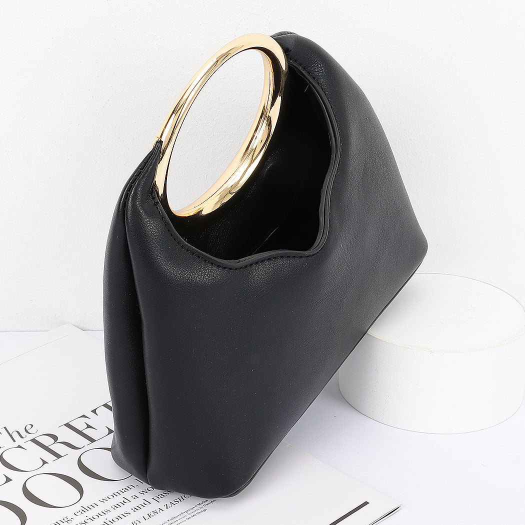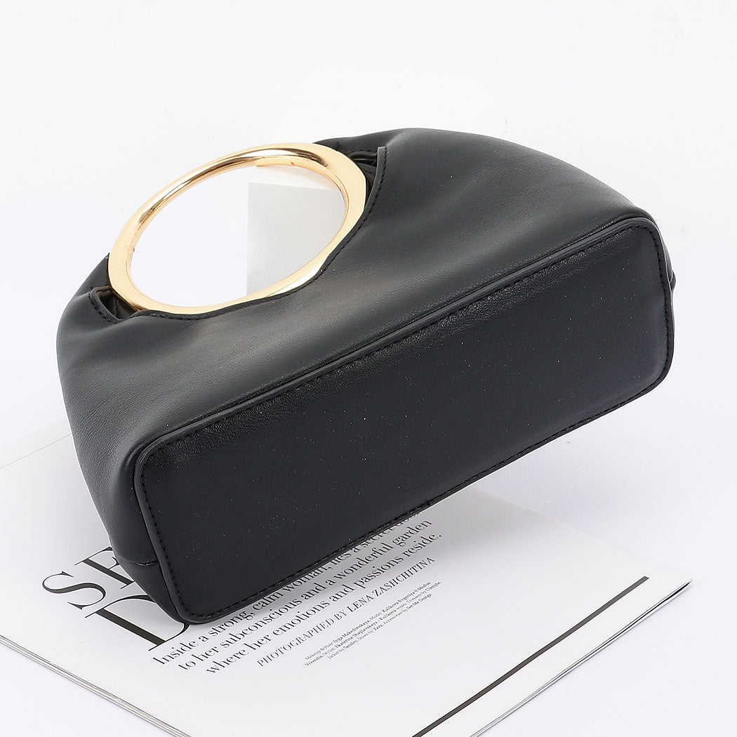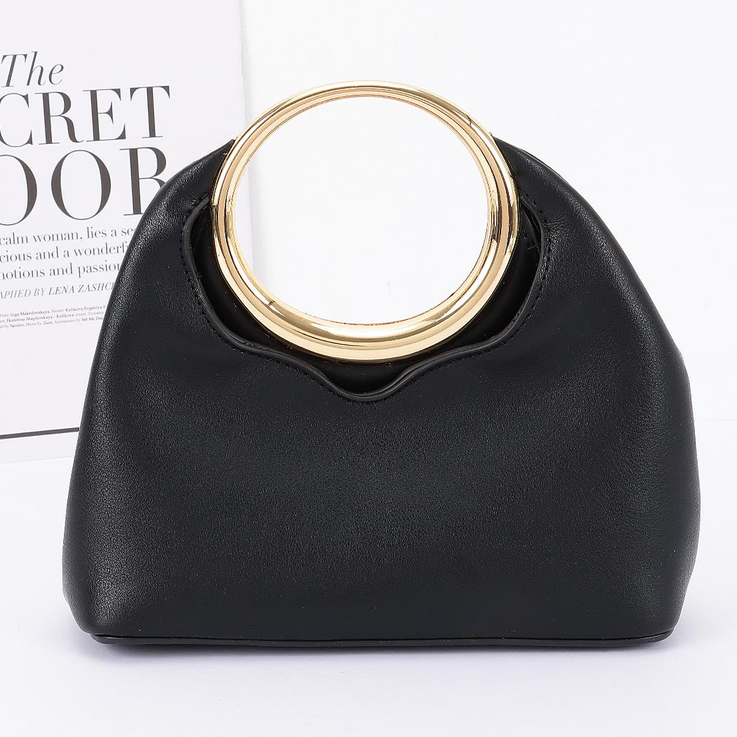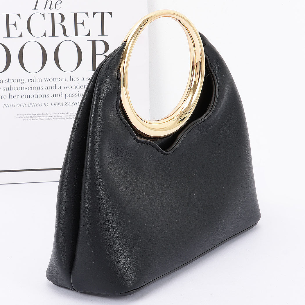 * Faux Leather Round Metal Handle Bag Polyurethane,Mixed Metal. * Introducing the "Faux Leather Round Metal Handle Bag" – a stunning faux leather bag that perfectly combines style and sophistication. With its chic round metal handle, this bag is designed for the modern woman who values both fashion and functionality. Elevate your wardrobe with this exquisite piece