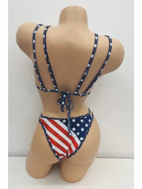 Make a bold statement with this stunning American flag-inspired bikini set, perfect for beach days, pool parties, and festive summer celebrations! Features: -Eye-Catching Design - Show off your patriotic spirit with a striking stars and stripes print in red, white, and blue. -Flattering Triangle Top - Adjustable double shoulder straps and back tie closure for a custom, secure fit. -Strappy Bikini Bottom - High-cut, cheeky fit with stylish double side straps for a trendy and flattering look. -Comfortable & Stretchy - Made from a high-quality, quick-drying fabric blend for all-day wear. -Imported Ideal for 4th of July, Memorial Day, or any summer adventure, this bikini set combines style and comfort, making you stand out with confidence! Available