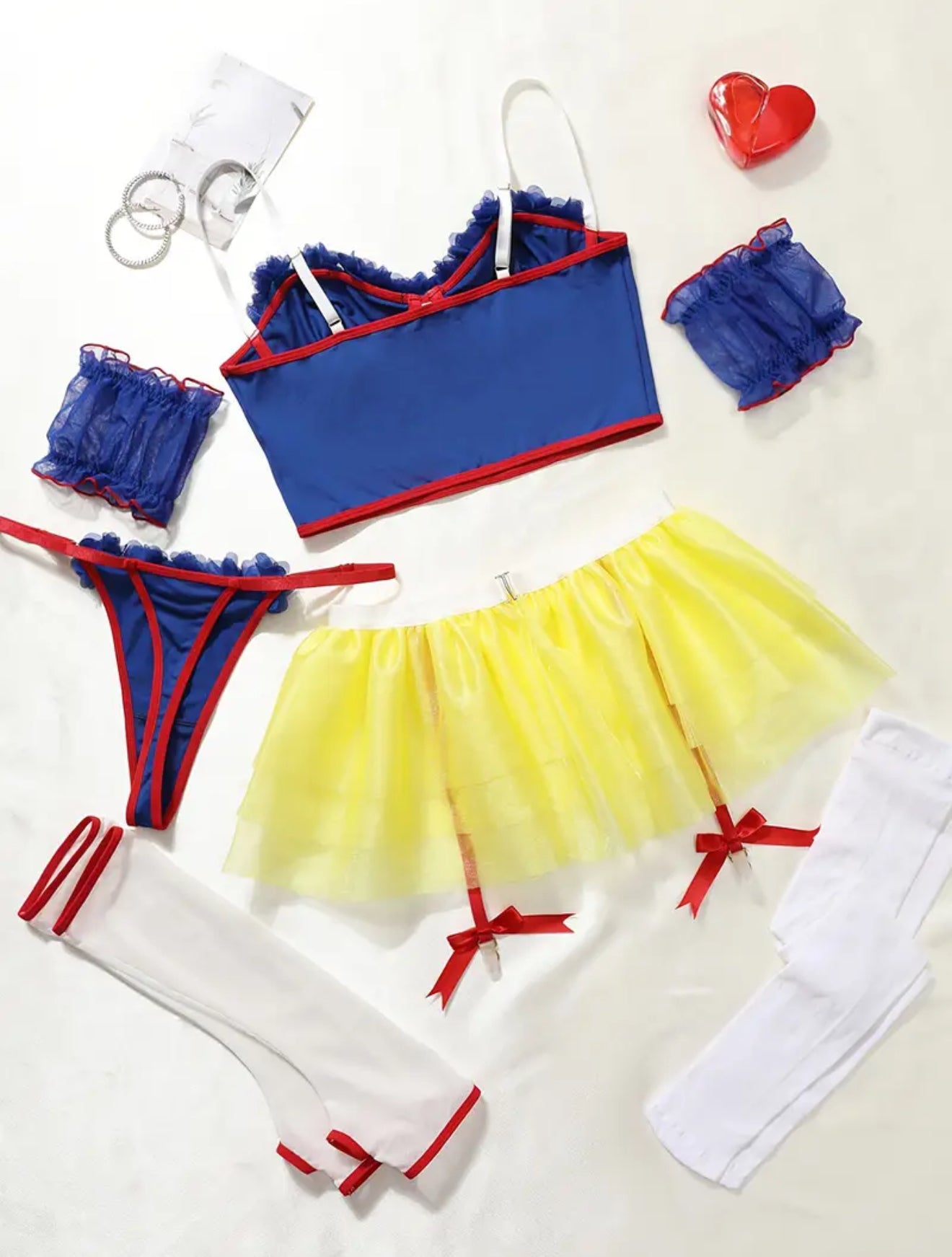 1set Sexy Women's Outfit Adult Role Playing Fairytale Princess Lingerie Set-Delicate Lace Trim Bra Skinny Underwire Top Flirty Short Skirt, Dainty Arm Ring-Halloween Romantic Set, Crop Top Arm Sleeves, Garter Belt And Panties, Puffy Skirt & Stockings