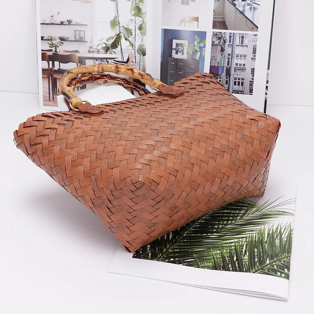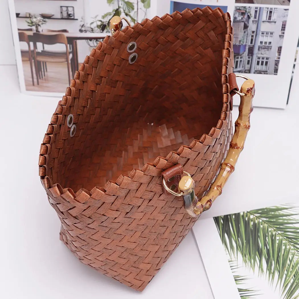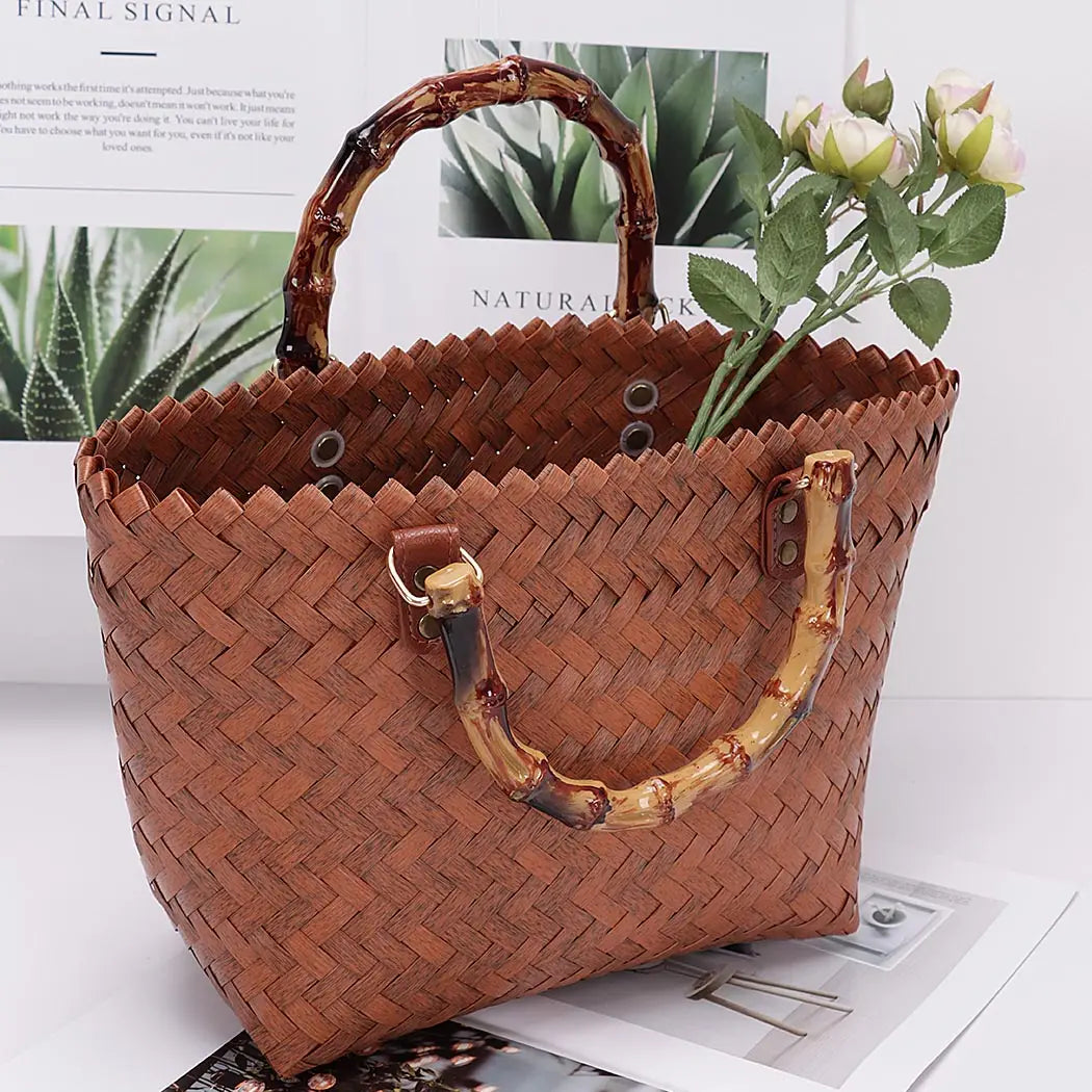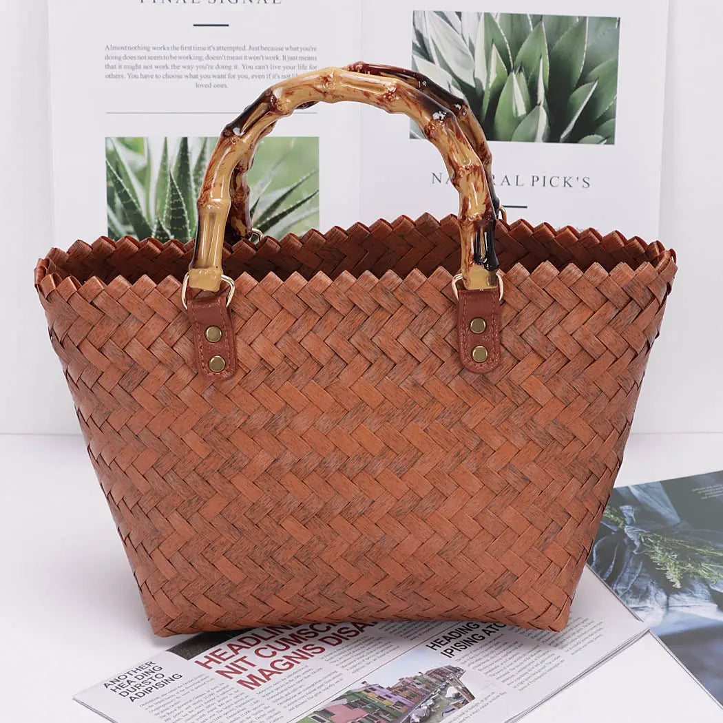 * Pvc Braided Top Handle Bag * 13W*8H*5D * PVC. * Introducing the "Bamboo Breeze" tote bag. Crafted with care, this brown woven basket bag features faux bamboo handles that add a touch of sophistication to your ensemble. With its spacious interior and sturdy design, the "Bamboo Breeze" is the perfect companion for your everyday adventures.